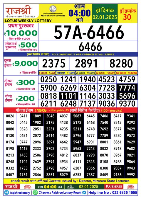 Rajshree Lotus Weekly Lottery 4pm Result 14 August 2025