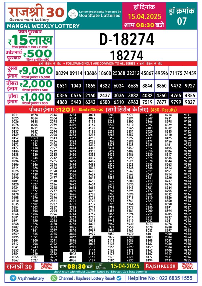 Rajshree 30 mangal weekly lottery 8.30pm result 15 April 2025 Leave a Comment on Rajshree 30 mangal weekly lottery 8.30pm result 15 April 2025