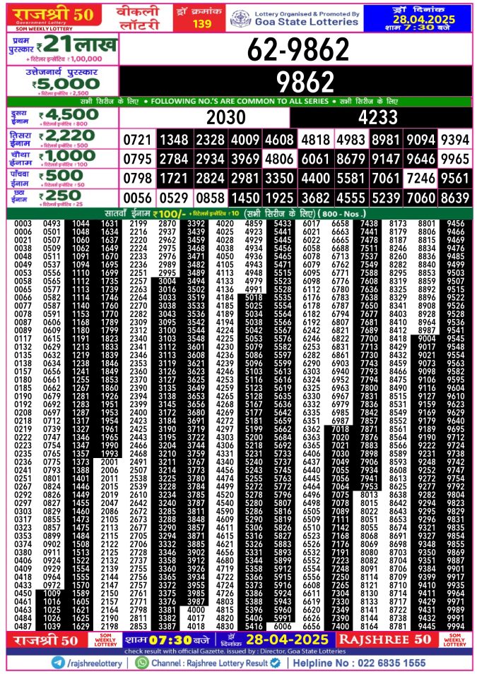Rajshree 50 som weekly lottery 7.30pm result 29 April 2025 Leave a Comment on Rajshree 50 som weekly lottery 7.30pm result 29 April 2025