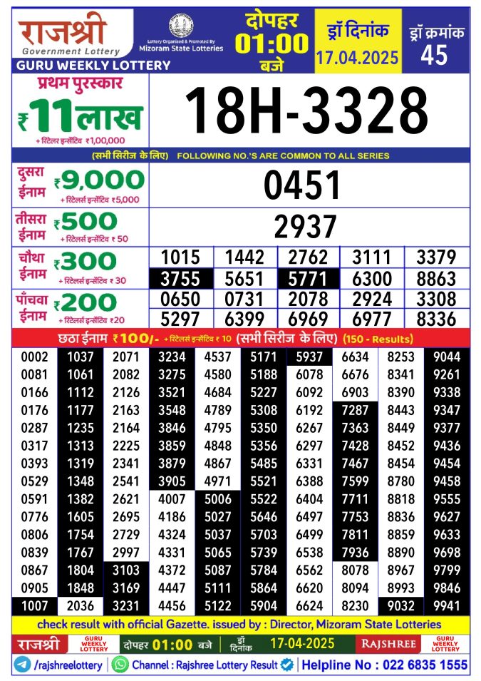 Rajshree guru weekly lottery 1pm result 17 April 2025 Leave a Comment on Rajshree guru weekly lottery 1pm result 17 April 2025
